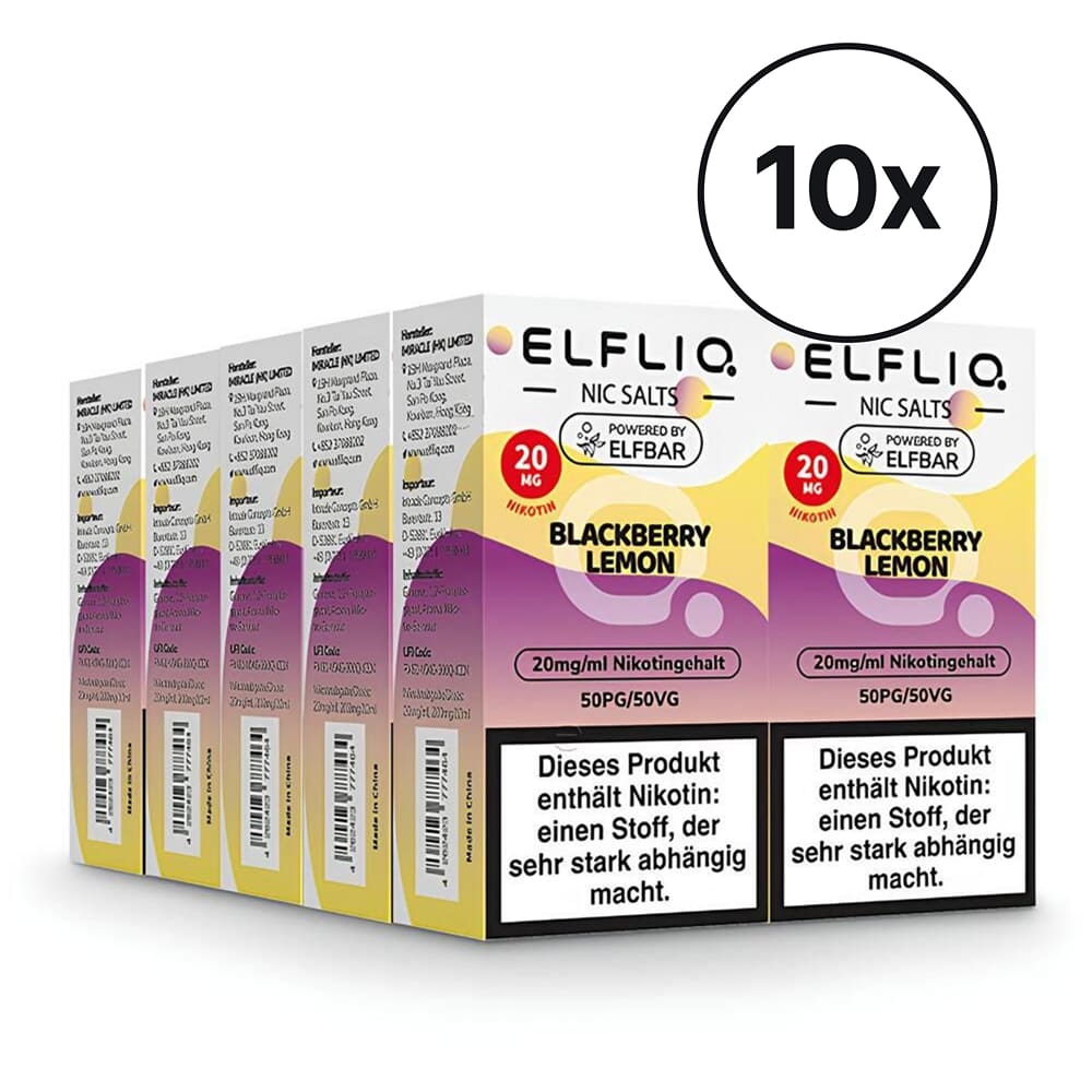 Spar-Bundle: Hol dir dein ELFLIQ Blackberry Lemon als Vorratspack und wähle oben deine Menge: 10er (10 Flaschen) oder 20er (20 Flaschen). Jede Flasche enthält 10ml – das sind insgesamt 100ml (10er) bzw. 200ml (20er). Die Nikotinstärke wählst du wie gewohnt über die Variante (10mg oder 20mg).